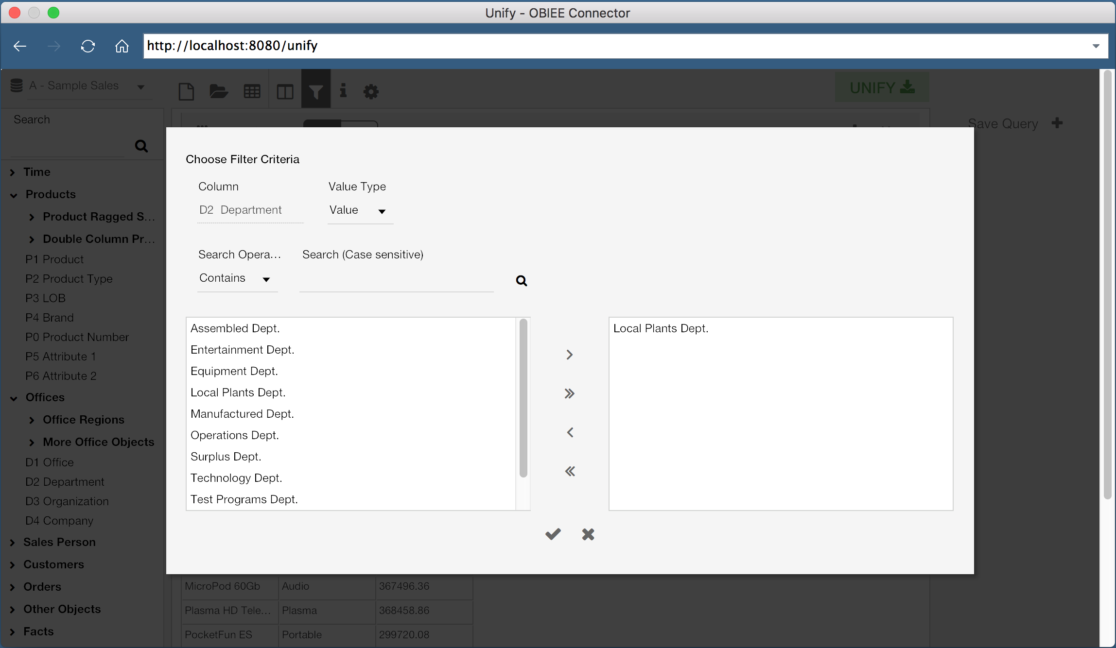 It’s also possible to add filters to our data set. By clicking the Filter icon at the top of the window, we can view the current filters for the query. We can then add filters the same way we would add columns, by double clicking or dragging the specific column. In the example shown, I have a query on the column “D2 Department” where the column value equals “Local Plants Dept.”.
