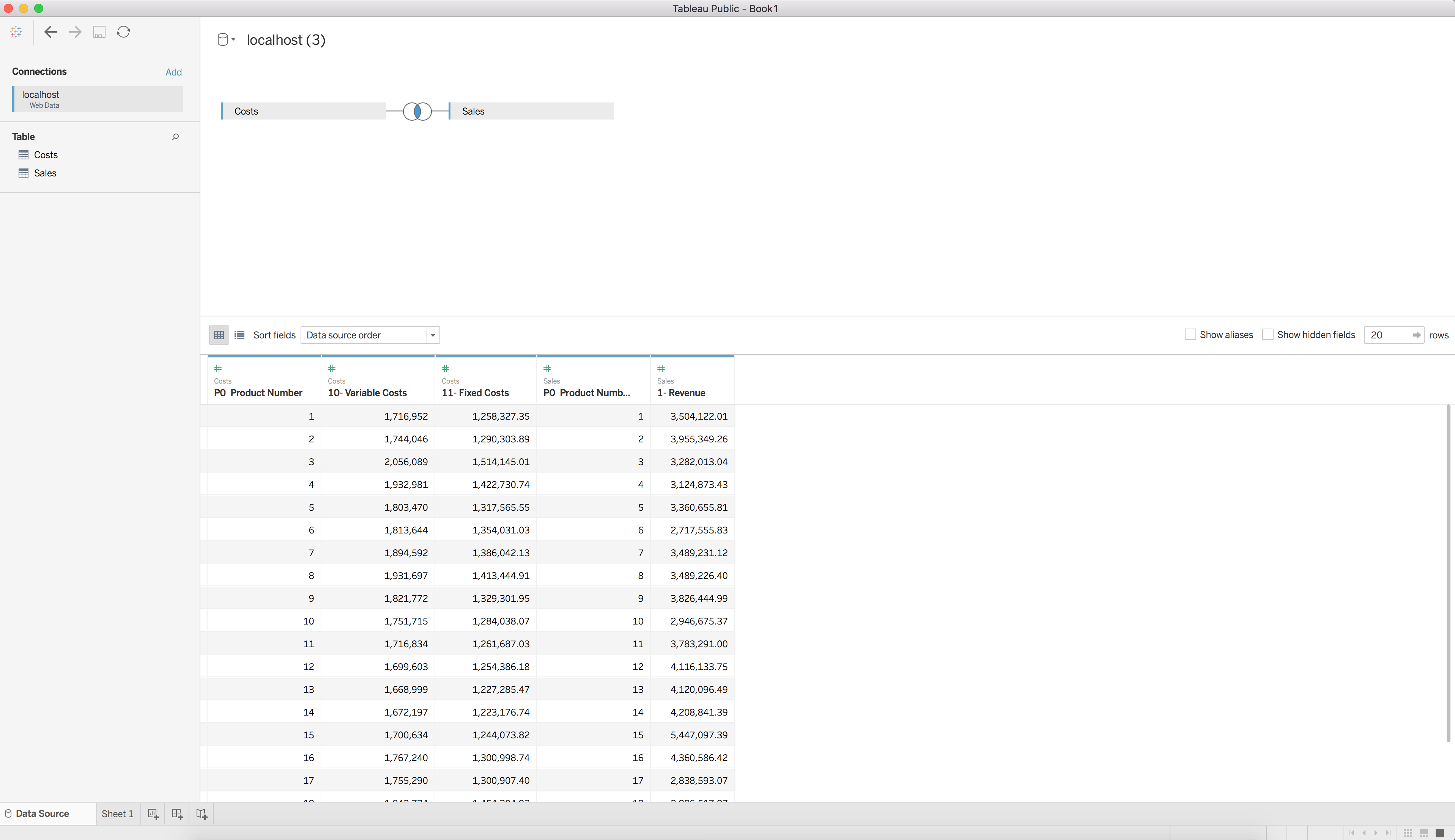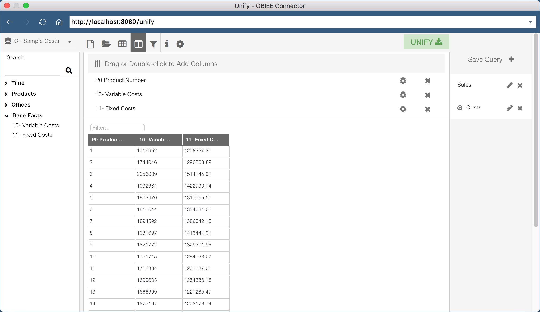 This second query is using the “C - Sample Costs” Subject Area, and is saved as “Costs”. This query contains the columns “Product Number”, “Variable Costs”, and “Fixed Costs”.