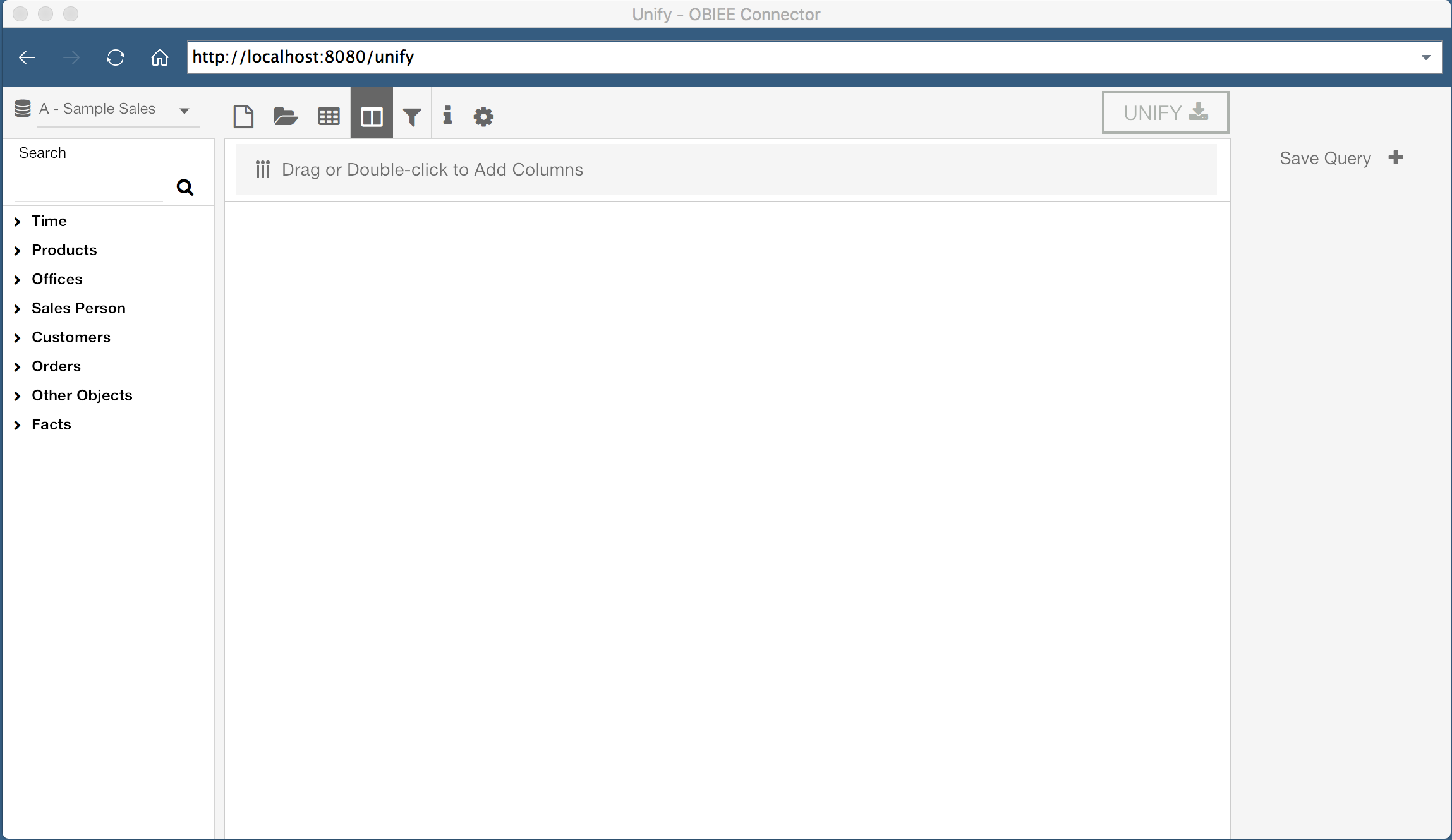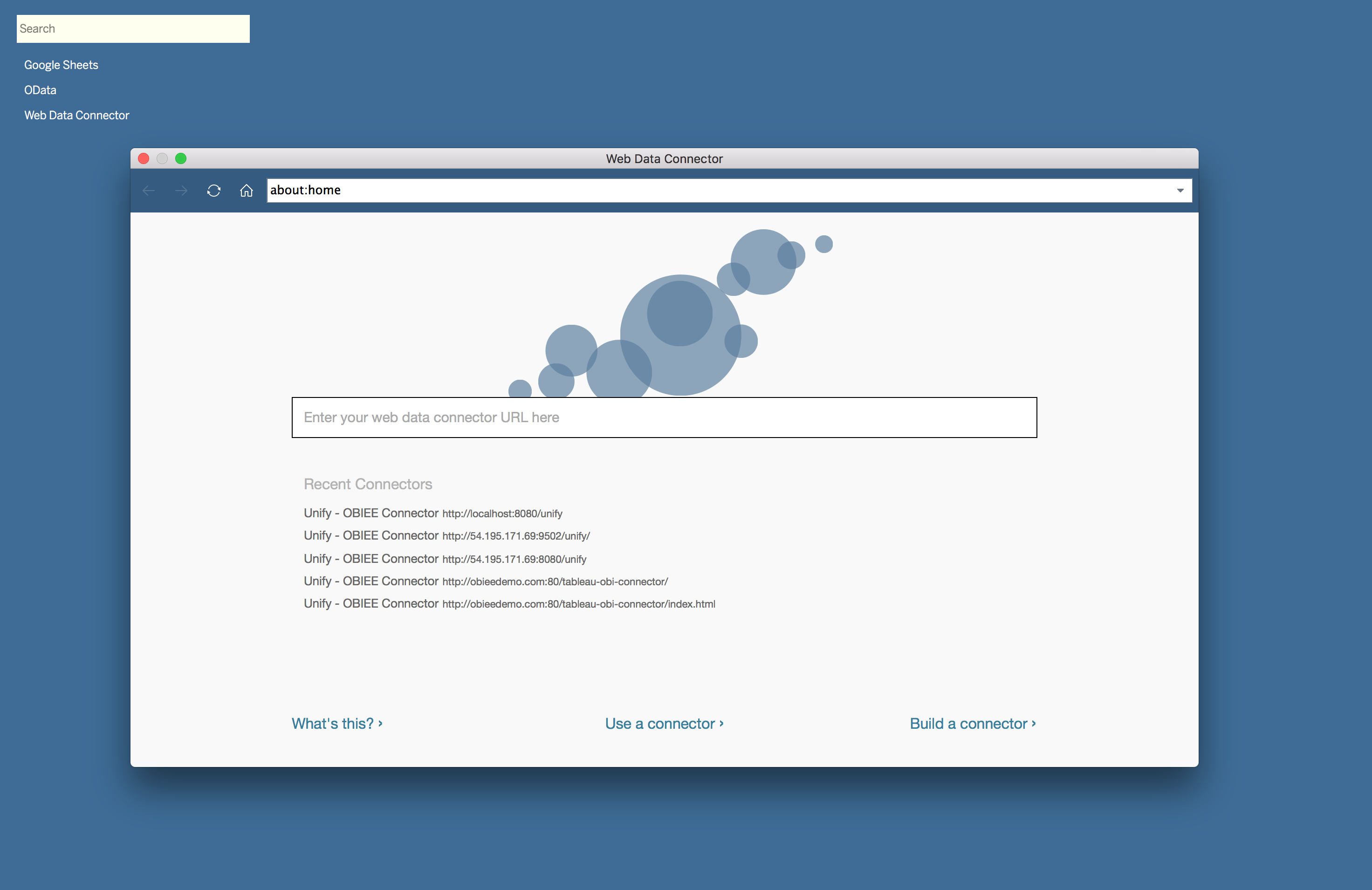 To start pulling data from OBIEE using Unify, we need to create a new Web Data Connector Data Source in Tableau. This data source will prompt us for a URL to access Unify. In this instance, Unify is installed as a desktop application, so the URL is http://localhost:8080/unify.
