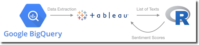 When the data is in BigQuery, the analysis follows the same approach as before with Tableau connecting directly to BigQuery and using again R for word sentiment scoring.
