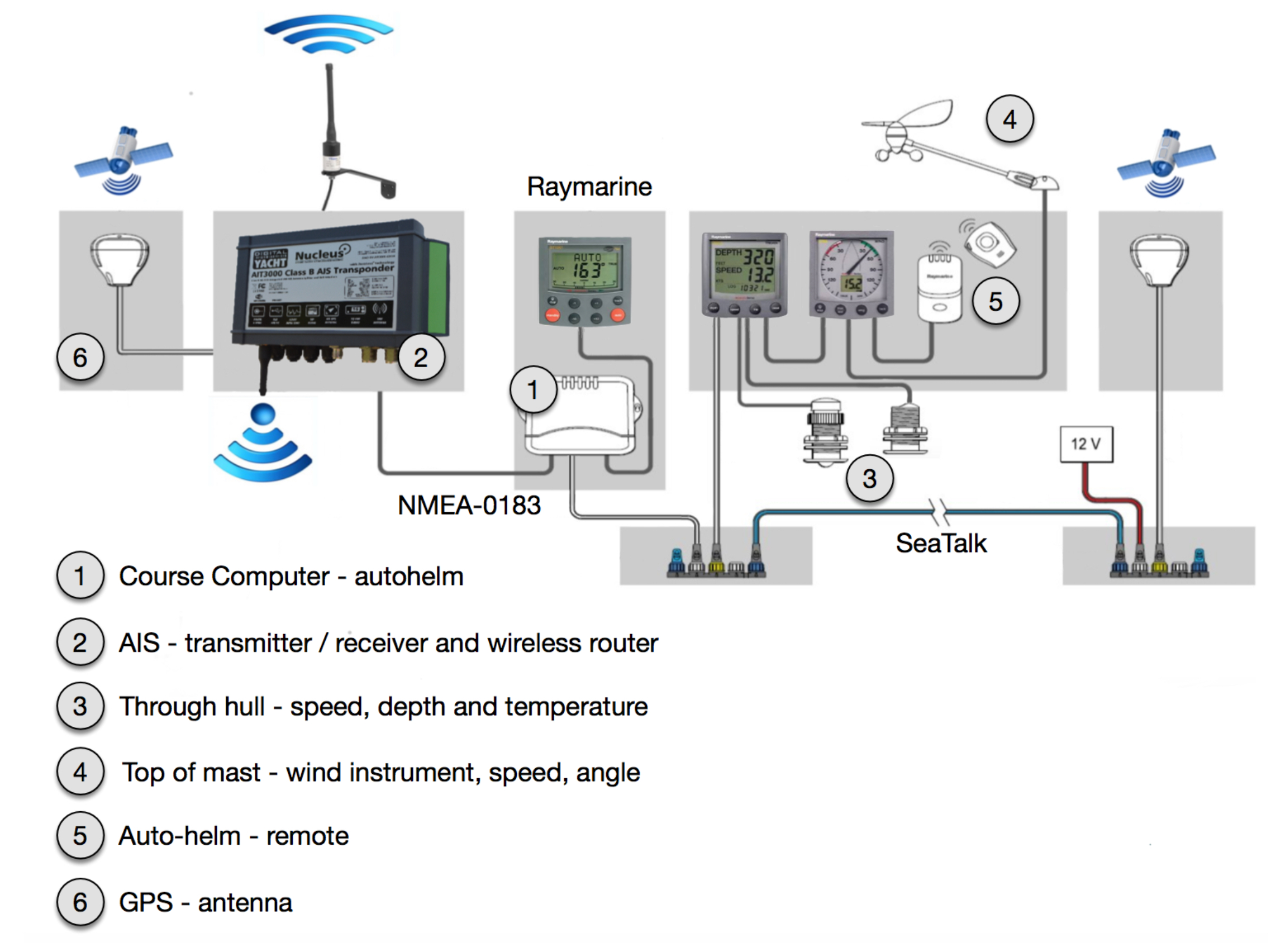The instruments are by Raymarine. We have a wind vane, GPS, speed sensor, depth sounder and sea temperature gauge, electronic compass, gyroscope, and rudder angle reader. These are all fed into a central course computer. Some of the instrument displays share and enrich the data calculating such things as apparent wind angles as an example. All the data travels through a proprietary Raymarine messaging system called SeaTalk. To allow Raymarine instruments to interact with other instrumentation there is an NMEA-0183 port. NMEA-0183 is a well-known communication protocol and is fairly well documented so this is the data I need to extract from the system. I currently have an NMEA-0183 cable connecting the Raymarine instruments to an AIS transponder. The AIS transponder includes a Wireless router. The wireless router enables me to connect portable devices to the instrumentation.