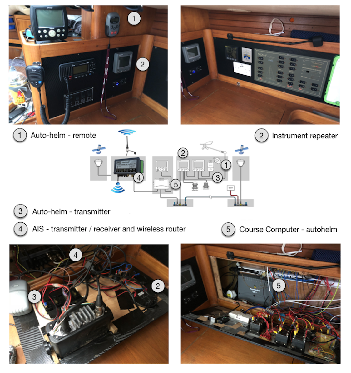 The following image shows the existing setup, what's behind the panels and how it links to the instrument architecture documented in Part 1. No laughing at the wiring spaghetti - I stripped out half a tonne of cable last year so this is an improvement. Most of the technology lives near the chart table and we have access to the navigation lights, cabin lighting, battery sensors and DSC VHF. The top left image also shows a spare GPS (Garmin) and far left an EPIRB.