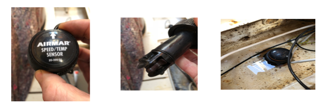 While spooling the message I artificially generate some speed data by spinning the wheel of the speedo. The image below shows the speed sensor and where it normally lives (far right image). The water comes in when you take out the sensor as it temporarily leaves a rather large hole in the bottom of the boat, don't be alarmed by the little puddle you can see.