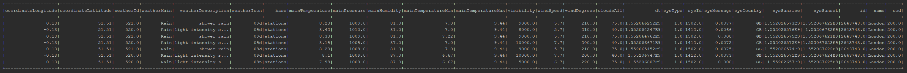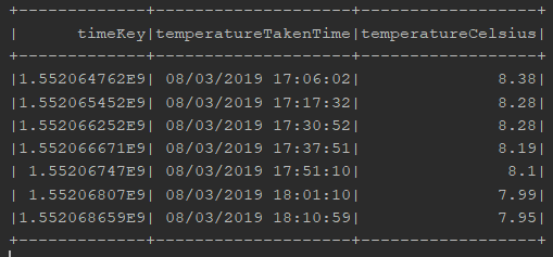 distinctDF.show()The result - only 7 distinct weather measurements, confirming our suspicion that we are only getting a weather update approximately every 10 minutes: