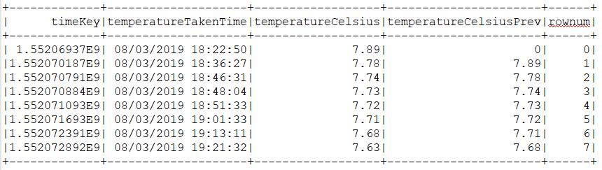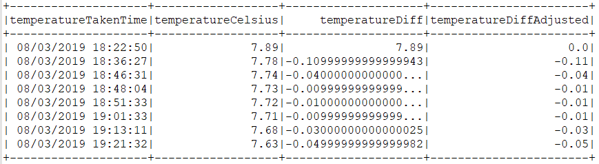 Note the inputs for the Spark lag function: The first is the source column name, the second is the lag offset and the third is default value - 0. The default value in our case will mean zero degrees Celsius, which will mess up our temperature delta for the first temperature measurement. Fortunately, Spark SQL also supports the CASE function so we can deal with this challenge with ease. In addition, let us round the result to get rid of the floating point artefacts.
