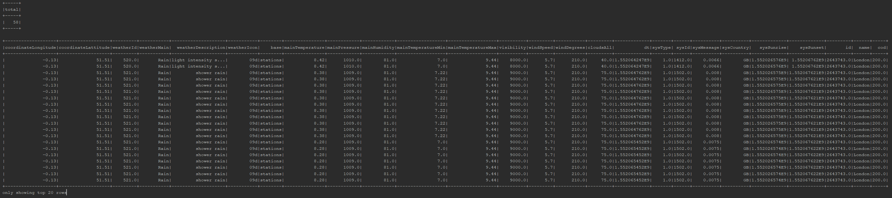DataFrame's show() function by default only shows 20 rows, but we can always adjust that to show more or less. However, as we had established earlier in our analysis, the weather data actually does not get updated every minute - we are getting lots of duplicate records that we could get rid of. It is easy with SQL's distinct: