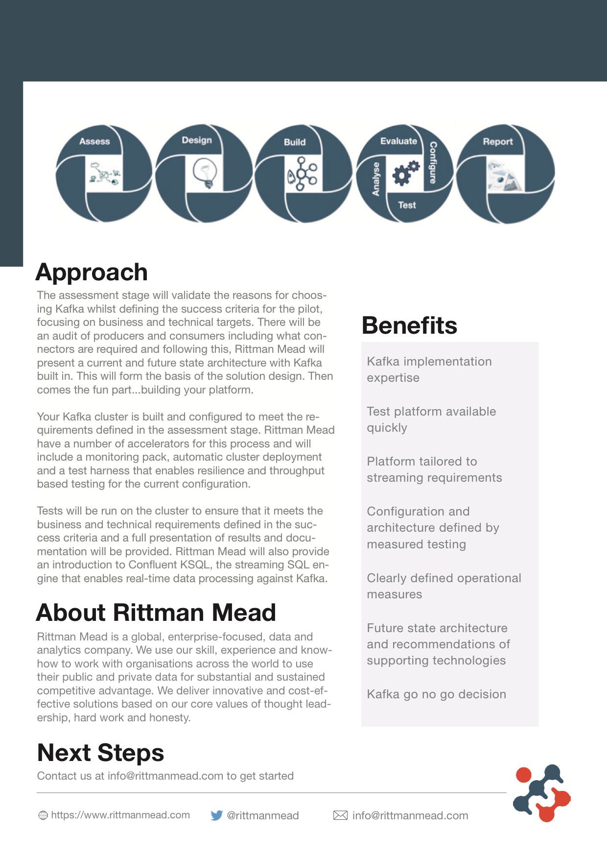 - A fully comprehensive output document detailing outcomes of the pilot, future state architecture featuring Kafka, installation & configuration details based on the platform and a roadmap for building towards a production ready platform