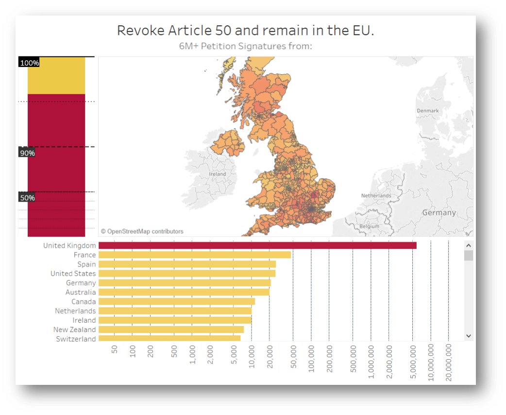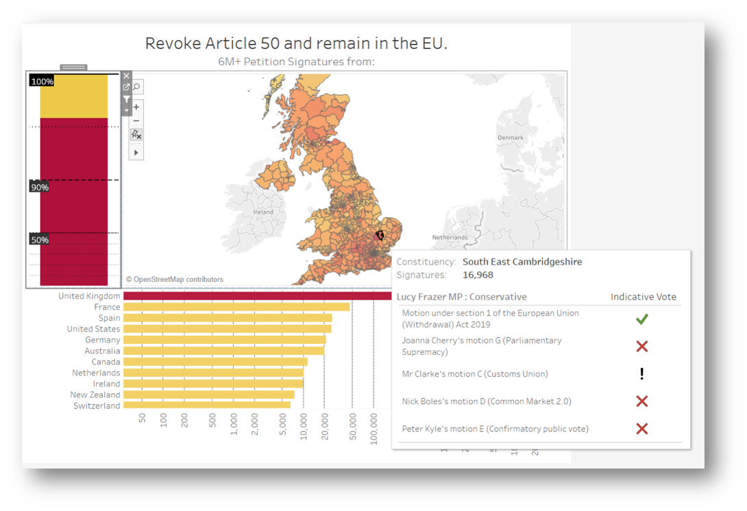 As you can see, 3 is a magic number here. The trio of visuals working together makes a dashing delivery of intel to the brain. With very little effort, we can see how many signatures come from the UK compared to rest of the world, how many thousands are coming from each country, how many from each constituency, who the MP you should be writing to is and how they voted in the indicative votes. Furthermore, this dashboard can keep track of all of that in real time, flagging any incoming surge of signatures from abroad, continuously counting the additional signatures until August 2019 and providing a transparent record of parliamentary votes in a format that is very easy to visually digest.