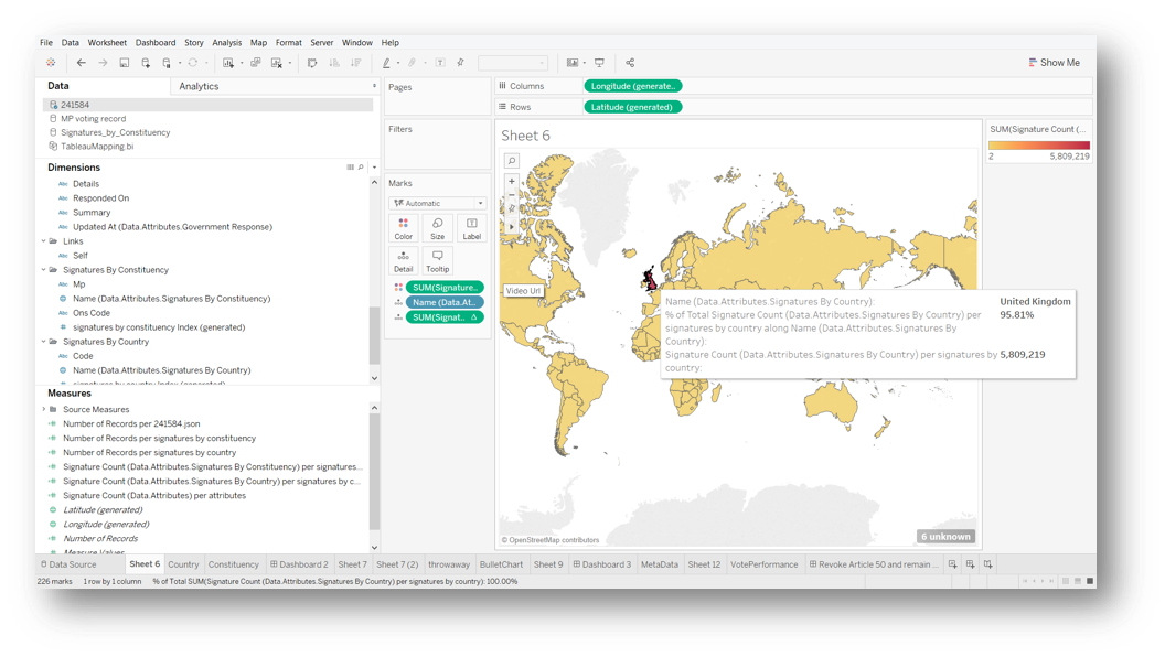 Tableau can handle JSON data quite well and, to nobody’s surprise, we quickly discover that over 95% of signatures are coming from the UK.