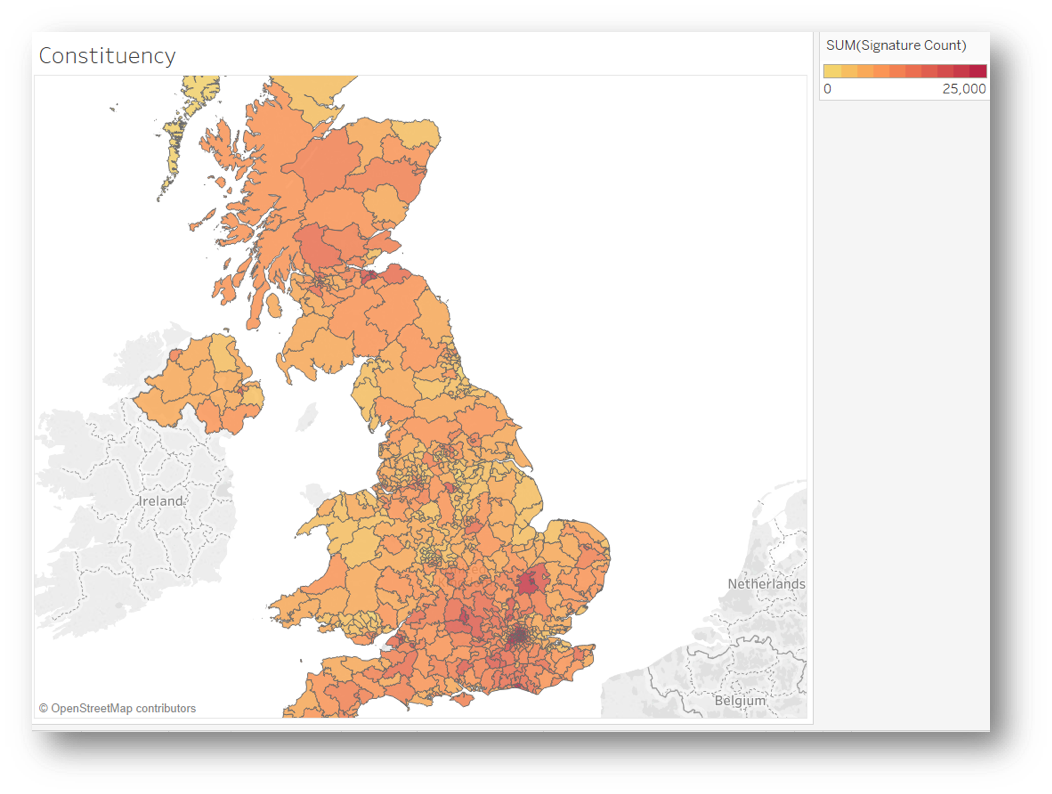 Because in this case we know more than 95% of signatures originate from the UK, the heatmap above is far more useful, showing us the signature count for each constituency at a glance. The hotter the shading, the higher the count.