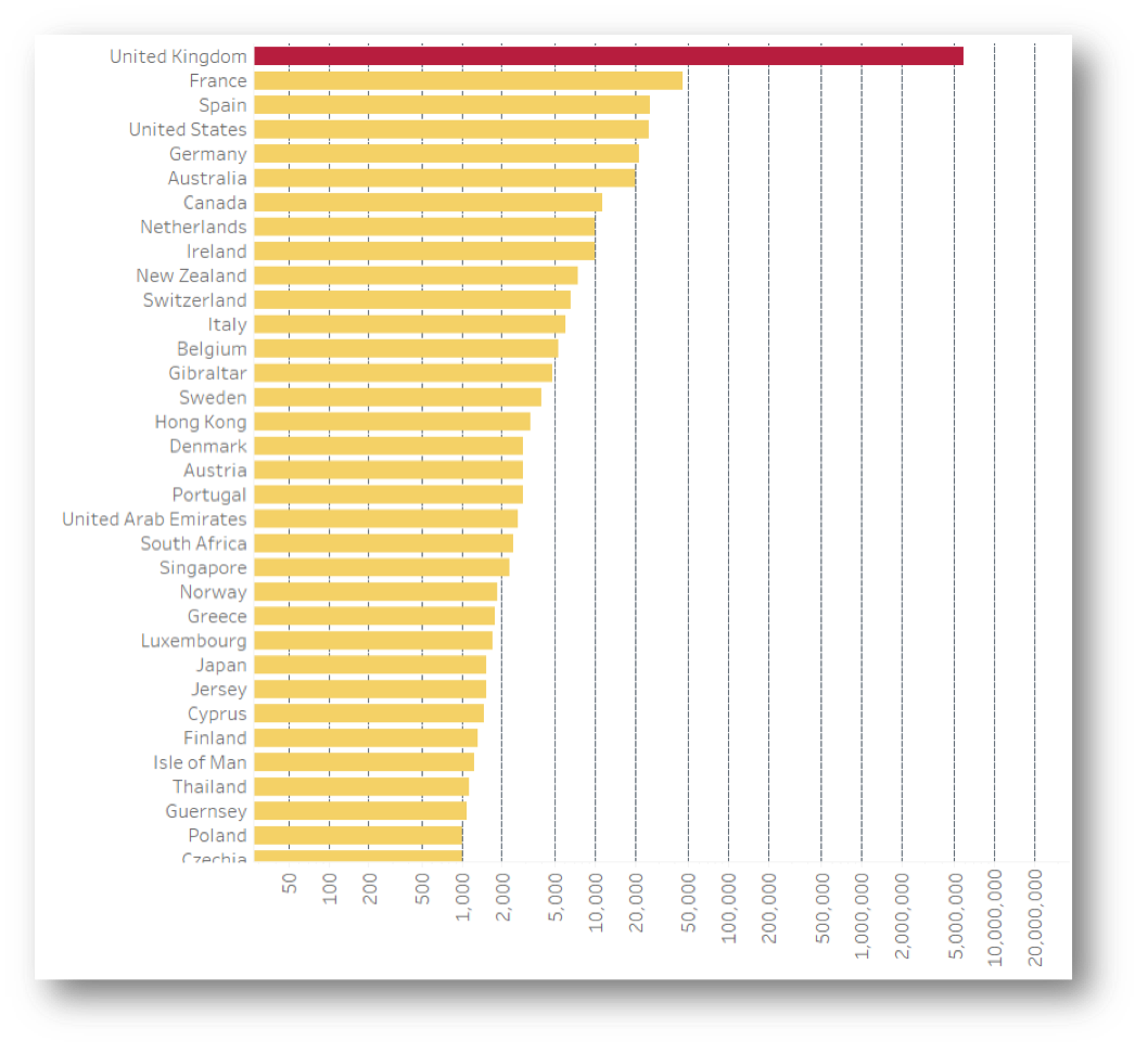 With a margin so tiny, it's trickier to get a visual that makes sense. A pie chart, for example, would hardly display the smaller slice containing all of the non-UK origin signatures. Even with a bar chart we are struggling to see anything outside of the UK in a linear scale; but it is perfect if using logarithmic scales, which are definitely a must in this scenario.