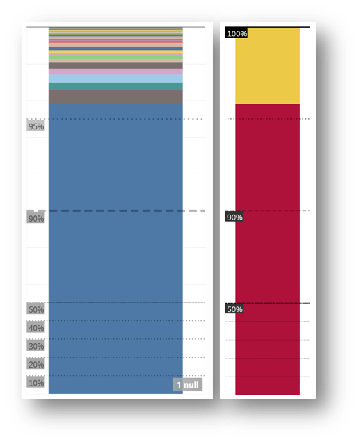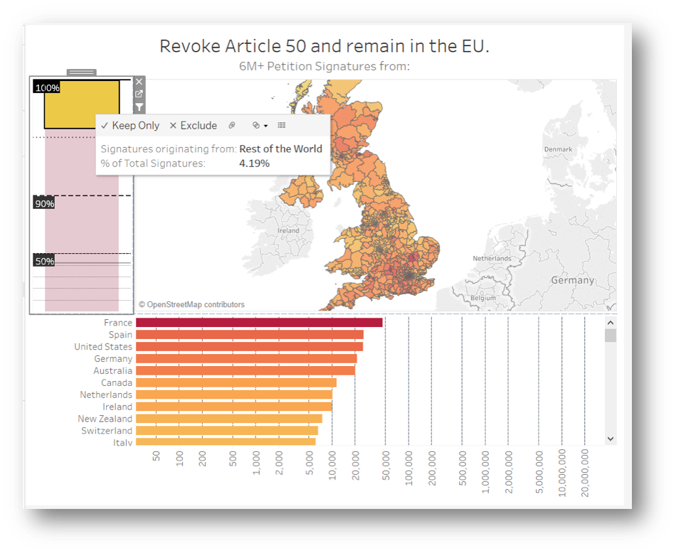 The logarithmic scale in Tableau isn't as useful for these %, so hacking the visualised values in order to amplify the data sections of interest is a perfectly valid way of thinking outside the box. In this example, half the graph is dedicated to 90-100% and the other half 0-90%. The blue chunk is the percentage of signatures coming from the UK, while every other country colour chunk is still so small. Since the totals from other countries are about the same as each mainland constituency, it's more useful to see it as one chunk. Lastly, adding the heat colour coding keeps the visual integrity.