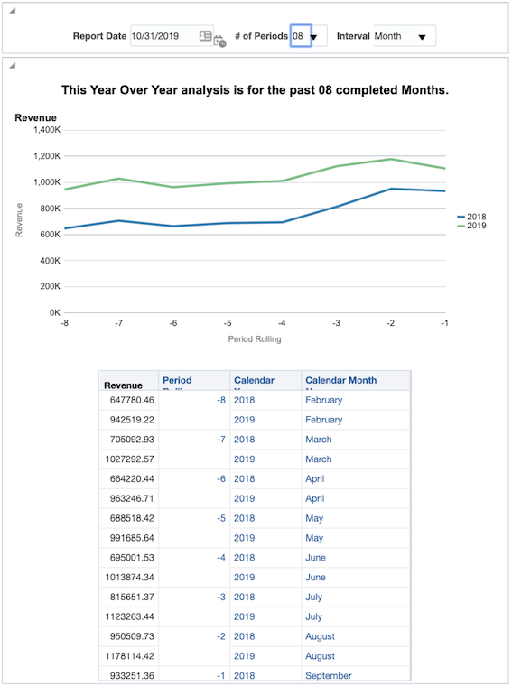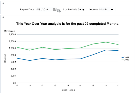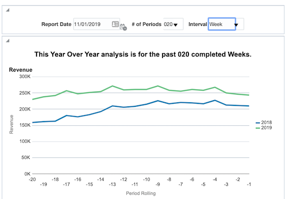 With the use of these filters and some creative dashboarding, you can construct a report that easily allows you to view a year over year analysis from any date in time for any number of periods either by month or by week.