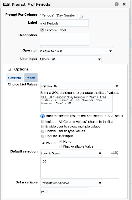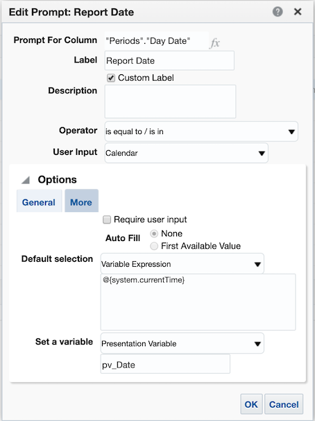 The first presentation variable we could introduce is to replace the CURRENT_DATE with a prompted value. Let’s call this presentation variable pv_Date,