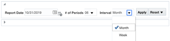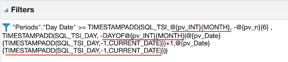 In order for our interaction between Month and Week to run smoothly we have to factor in one last consideration: if we are to take the date December 1st, 2019 and subtract one year we get December 1st, 2018. However, if we take the first day of this week, Sunday December 15, 2019 and subtract one year we get Saturday December 15, 2014. In our analysis this will cause an extra partial week to show up for prior years. To get around this we will add a case statement determining if '@{pv_INT}{MONTH}' = 'Week' THEN subtract 52 weeks from the first of the week ELSE subtract 1 year from the first of the month. With this, our final filter set will look like this: