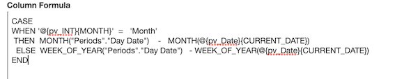 One more change on our filter to make it extra-flexible here is to use a new presentation variable to determine if you want to display year over year values, or by month, or by week. This can be done by inserting a variable into your SQL_TSI_MONTH and DAYOFMONTH statements; changing MONTH to SQL_TSI_@{pv_INT}{MONTH} and DAYOF@{pv_INT}{MONTH}, where pv_INT is the name of our variable.