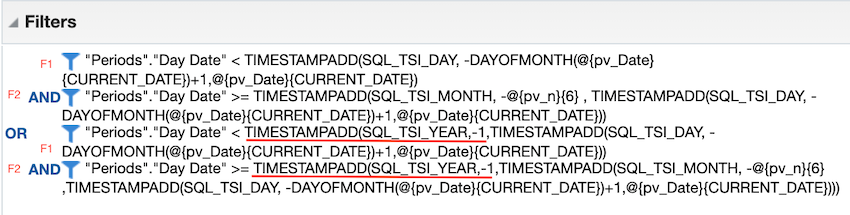 Our updated filter after replacing the CURRENT_DATE looks like below. Will will refer to this filter later as Filter 1 (F1).