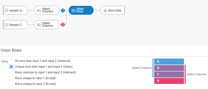 It’s worth mentioning there is also an operator called ‘Union Rows’. You can concatenate two datasets, provided they have the same number of columns with compatible datatypes. There are a number of options to decide how you want to combine the rows of the datasets.