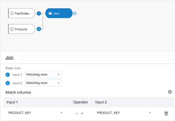 The process works similarly to how joins are defined in Data Flows; a pop-up window displays editable properties of the join with the same complexity - the options to change type, columns to match, the operator type relating them, and add join conditions.