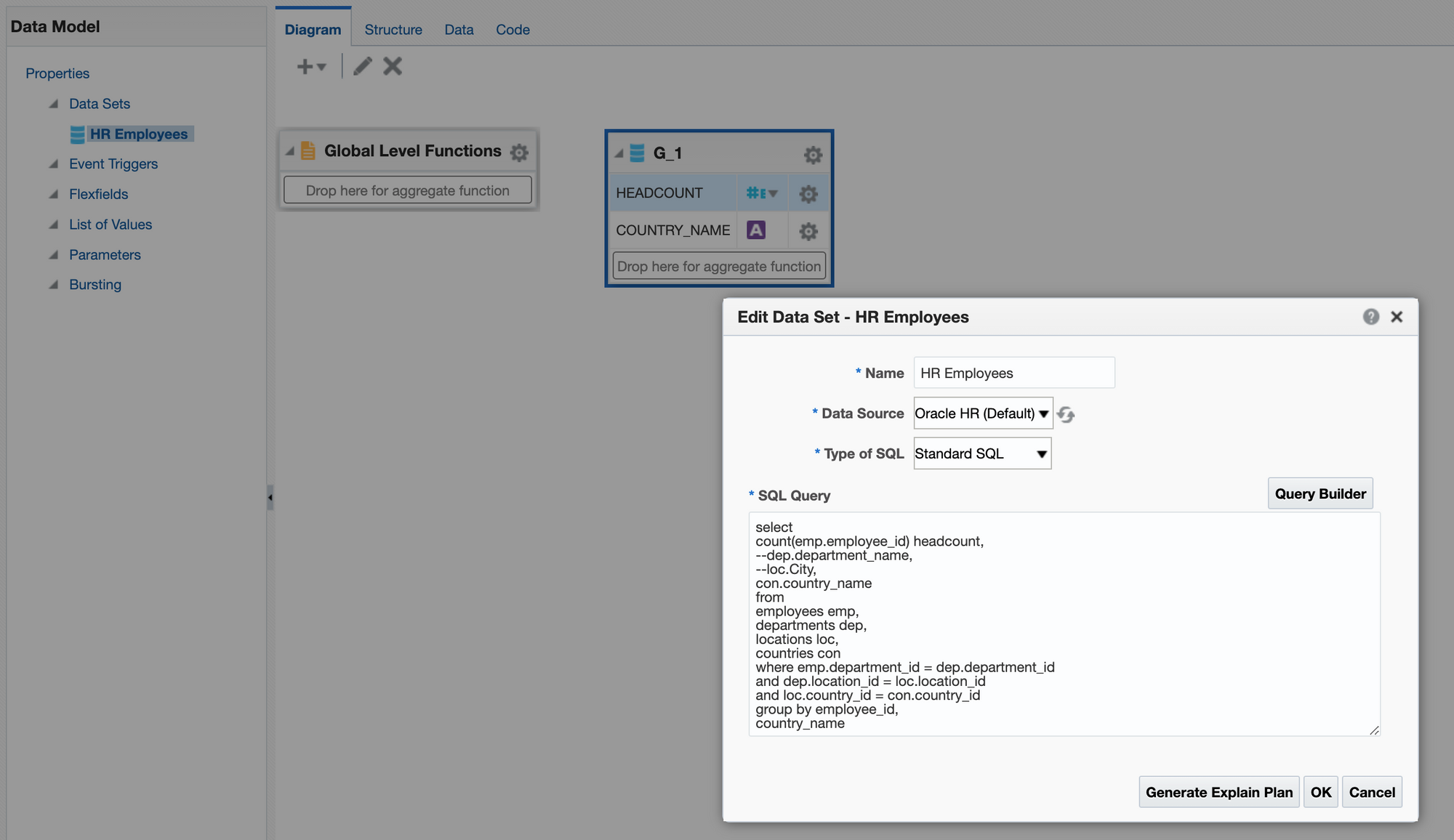 Then I created my data model, in this case with a bit of SQL (below). I also used the HR subject area to create another BI publisher HR salary report as its useful to be able to demonstrate both methods .