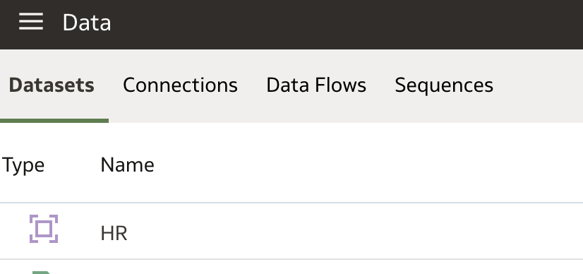 4) In OAS I navigated to the Datasets menu, and saw a new Dataset 'HR'. The purple box icon (below) denotes this is a OAS subject area.