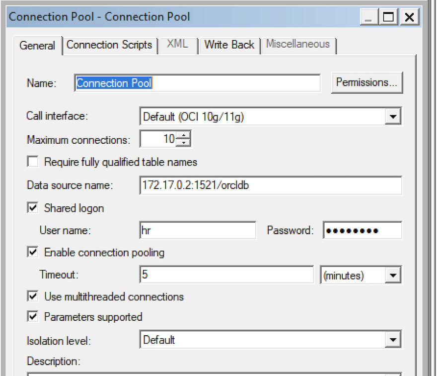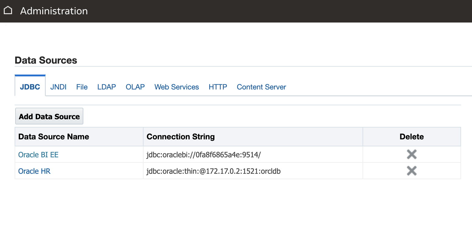 I changed the HR database connection pool to point to my docker container oracle database rather than my local database instance (the HR sample schema and data is identical in both databases). Note the Data source name IP in image below is the docker container IP for OAS (as identified in part 1 of this blog) not my local machine IP.