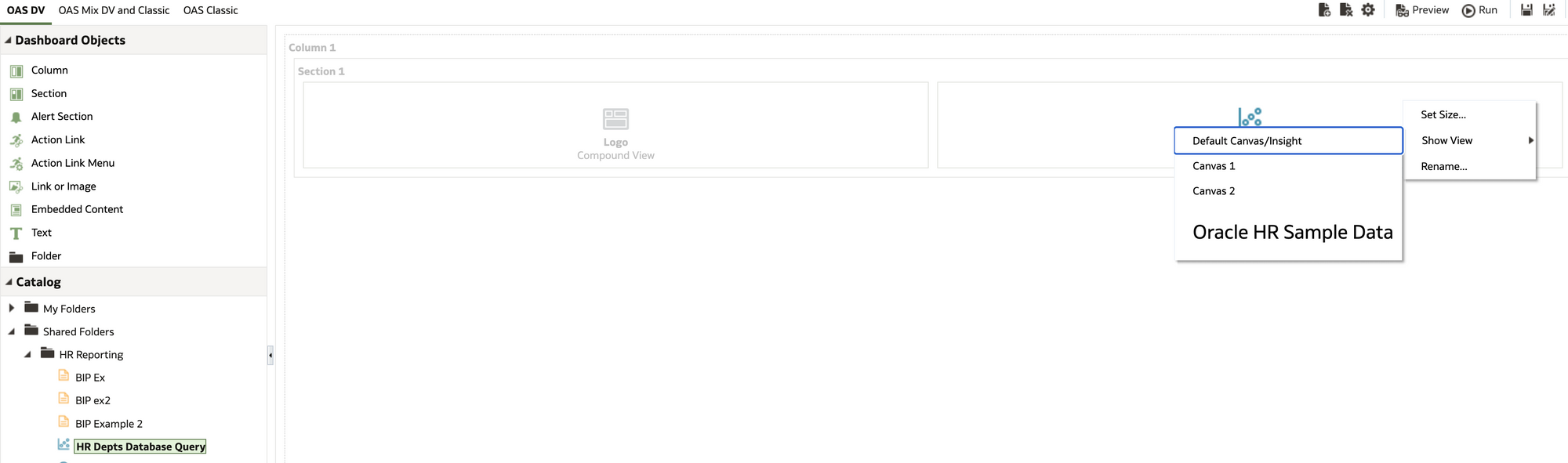 Is this blog (Part 2) I am going old school. What if I want to leverage my existing HR OBIEE developments and recreate / migrate my existing BI subject areas to OAS and write the BI reports in OAS with the same interface OBIEE uses. What if i want to move my current HR BI Publisher reports into OAS? In addition what if i want to mix and match all the visualisations and BI reports in OAS. DV/Classic BI/BI Publisher etc on a BI Dashboard.