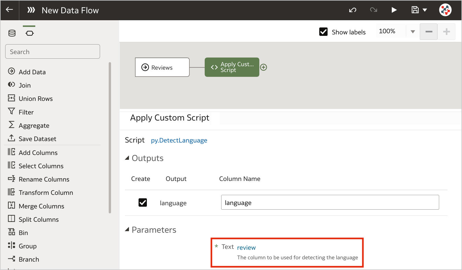 Configure the step by specifying any required input and the outputs that you want to include into the result set. In the example, I chose to detect the language for the review column.