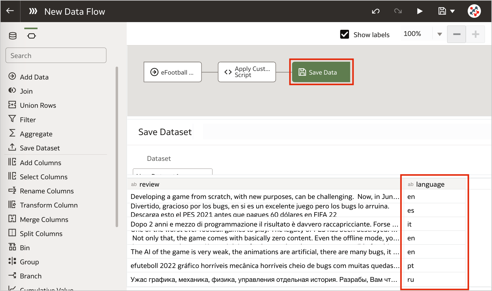 Save the output data by adding the Save Data step and run the data flow to execute the custom script.