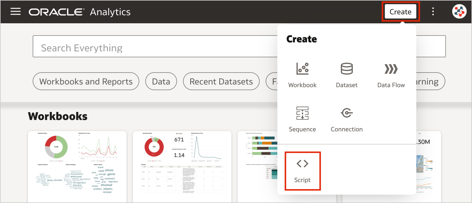 In the Home page, click on the Create button and select the Script option.