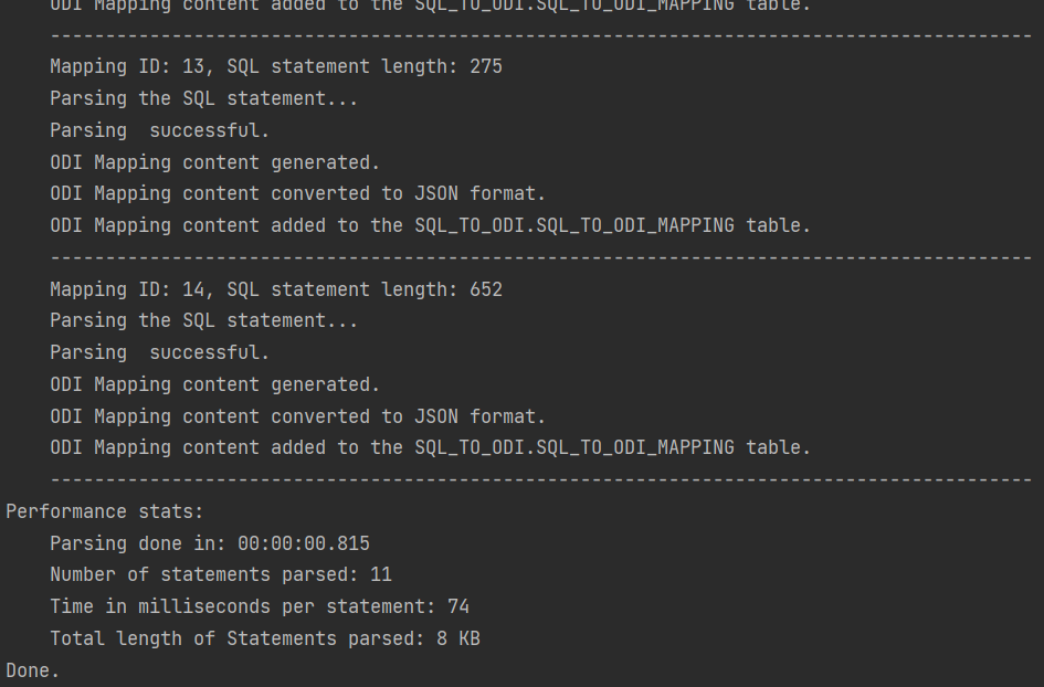 Total length of Statements parsed: 61 KBThe ODI Content Generator however is a different story. ODI content generation based on the parsing result written in the metadata table is done by a bunch of Groovy scripts, which query and update the ODI Repository repeatedly in the course of creating a single ODI Mapping, and they are subject to object locks in ODI Repository. Content generation is much slower than Parsing and its performance will depend heavily on the speed of your dev environment, how complex the Mappings are, do you set up Physical Design, validate and create Scenarios as part of creation, etc. On my test system it takes a couple of seconds for a Mapping to be fully generated, validated, Scenario generated.