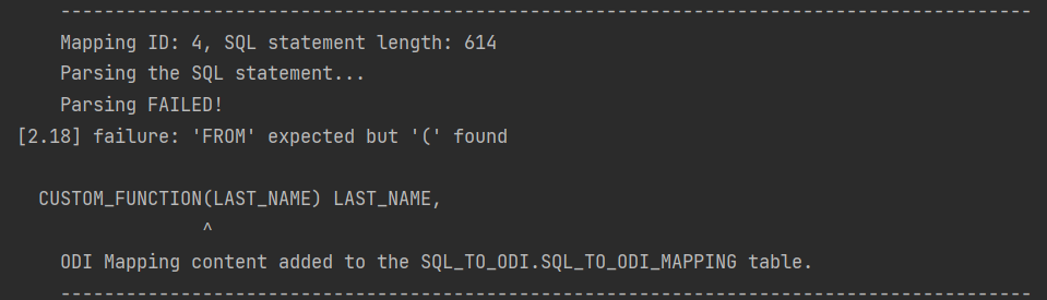 It will say it expects something else instead of the opening bracket ( whereas the problem is actually the function itself. Therefore it is a good idea to test and review all SELECT statements before passing them to the Sql2Odi tool.
