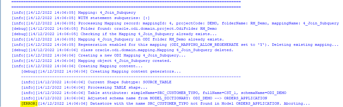 Because semantic errors can only be spotted upon trying to generate Mappings, many cycles of edit SELECTS -> parse -> generate ODI content may be necessary.