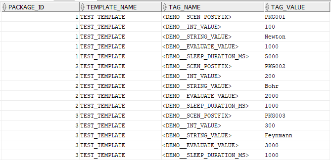 To generate 3 Packages based on a template that uses 5 tags, we need 15 records in the Package Tags metadata table. When the template is processed for each Package to be generated, tags will be replaced with these values: