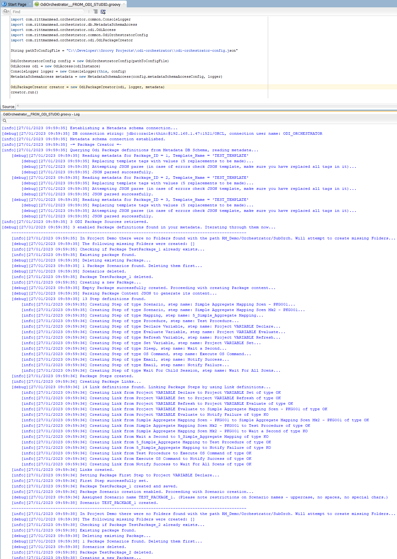 When the above metadata is defined, the Odi2Package Groovy script can be opened and run in ODI Studio. Run time depends on whether Package Scenarios are being created - when skipping Scenario creation, I am generating about 5 Packages a second on my test environment. With Scenario creation, a single Package creation typically takes a bit more than a second.