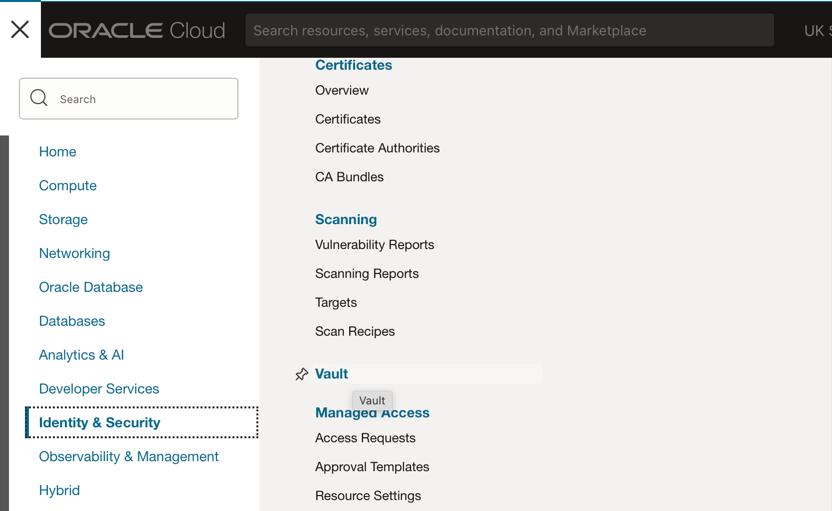 A Vault can be created from within the compartment you’re using, by navigating to Identity & Security → Vault in the OCI Console. Depending on your security/ policy settings creating a Vault might be the role of an admin on your OCI tenancy.