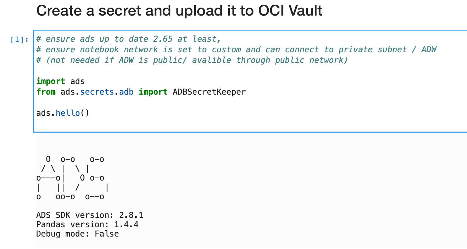 Its worth noting that while here we use ADBSecretKeeper to store and retrieve credentials for an Autonomous Database, ADS has classes to store and retrieve other kinds of credentials: BDSSecretKeeper for the OCI Big Data Service; MySQLDBSecretKeeper for Oracle MySQL Database; and AuthTokenSecretKeeper for various kinds of Auth Tokens (for example git tokens).