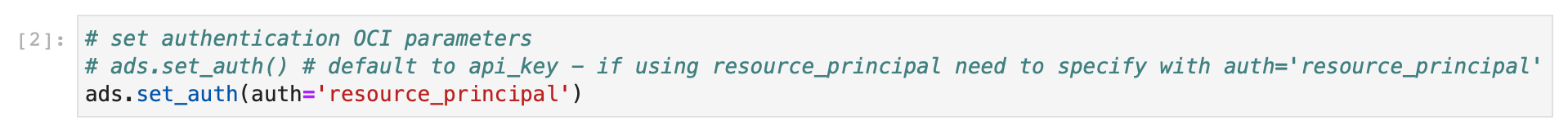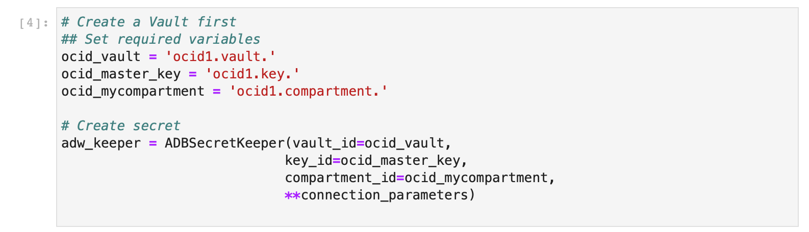 We have also imported ADBSecretKeeper from ads, this will allow us to read and write secrets from the OCI Vault. However, we will also need to ensure that we can authenticate ourselves in OCI to be able to use OCI resources. Here we will do this using the resource principal by running: ads.set_auth(auth='resource_principal')