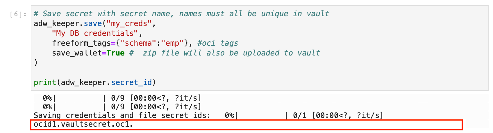 We can then save this Secret to the Vault, and print out the created secret OCID as follows: