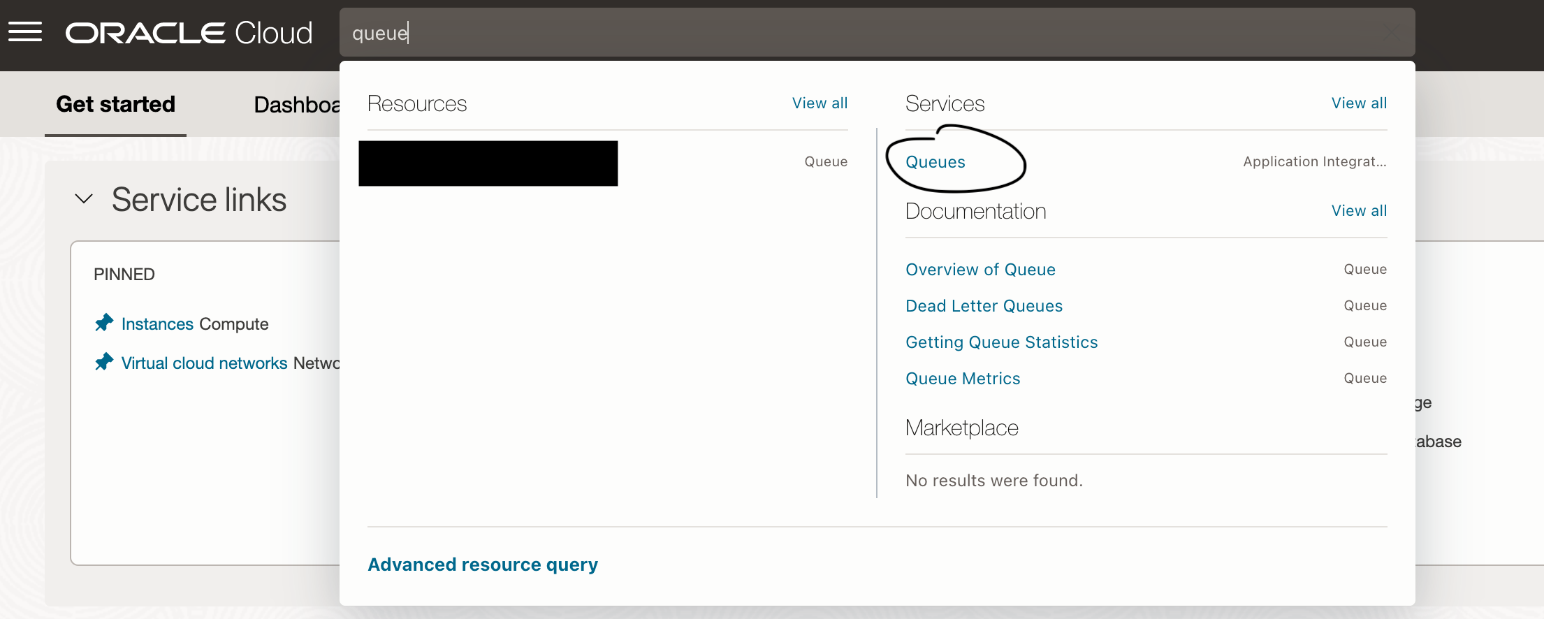 Access the Queue service in your OCI account. This can easily be done by searching for “Queue” in the search bar