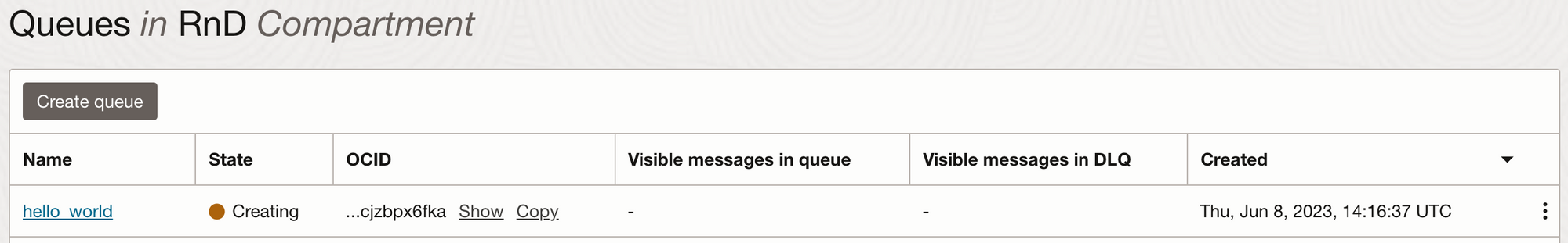Type the name of the queue and select the compartment where the queue should be created - We used hello_world and compartment RnD