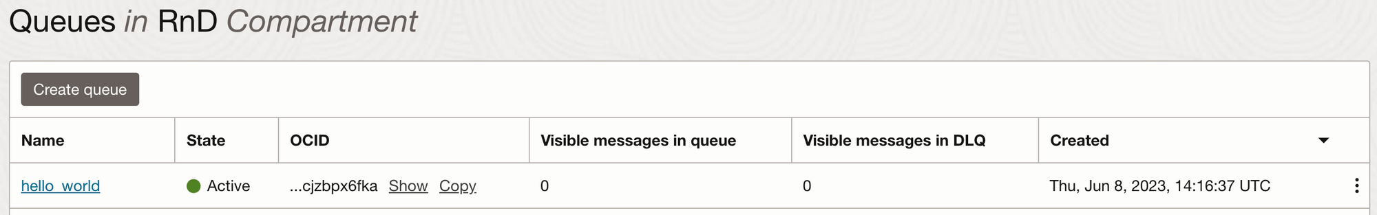 Click in the queue name - here hello_world, and in the queue information area gather the following attributes: OCID, DQL OCID, Messages Endpoint