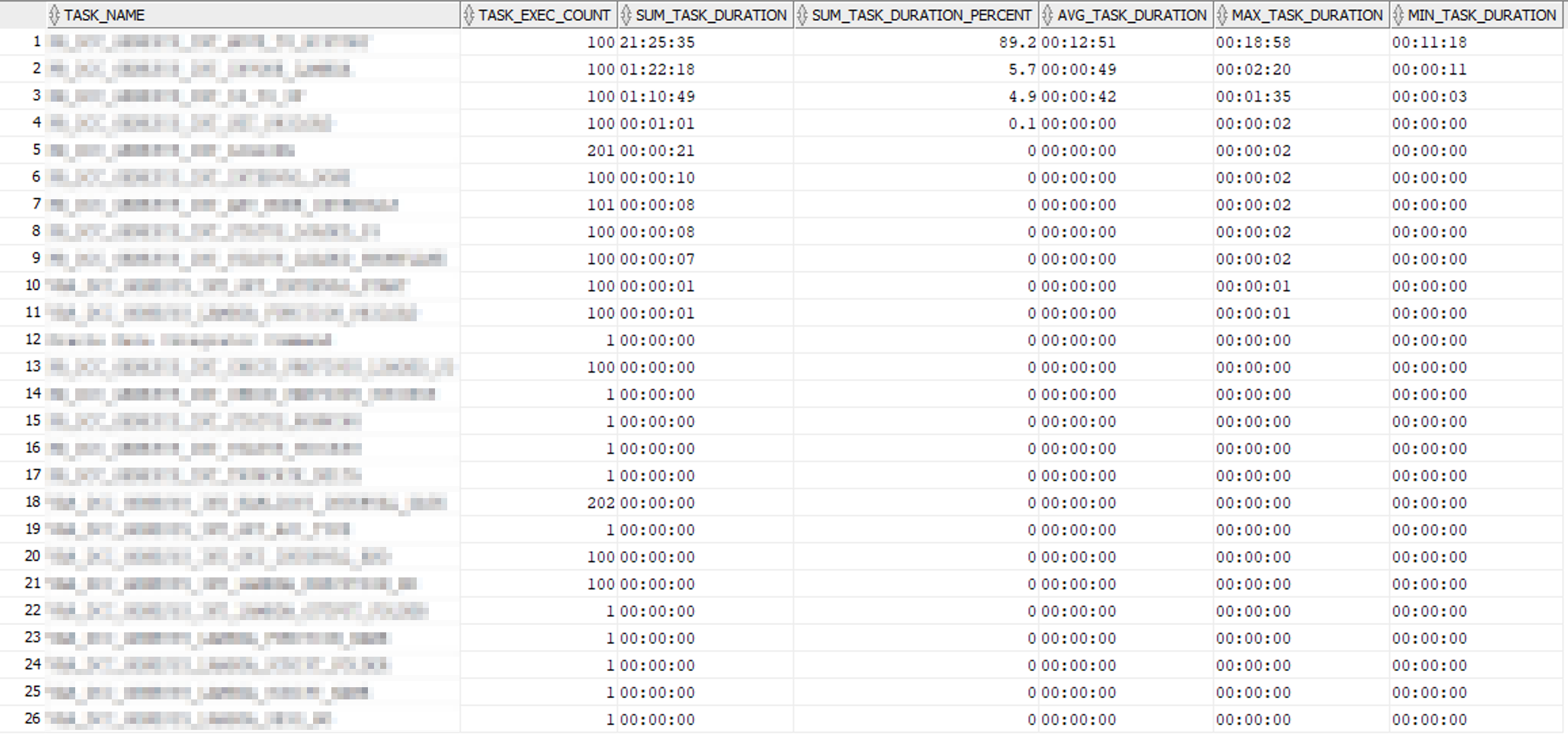 ROUND(100.0 * SUM(TASK_DURATION_SECONDS) / MAX(LP_TASK_DURATION_SECONDS),1) SUM_TASK_DURATION_PERCENT,
