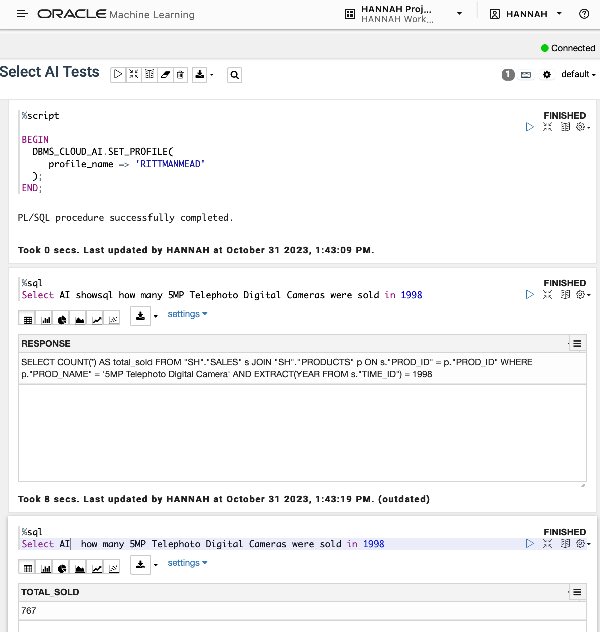 First you must set your profile to the one created above. From here I have tested the showsql and the default runsql actions, the generated query uses the SH.SALES table and the SH.PRODUCTS table.