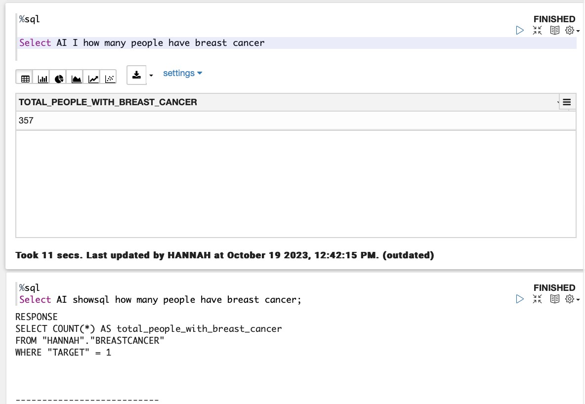 Since I added my own datasets: BREASTCANCER and WINE, to the tables listed in my profile creation statement, I can also query them. Select AI identifies the correct table to use and that the column “Target” represents people with breast cancer.