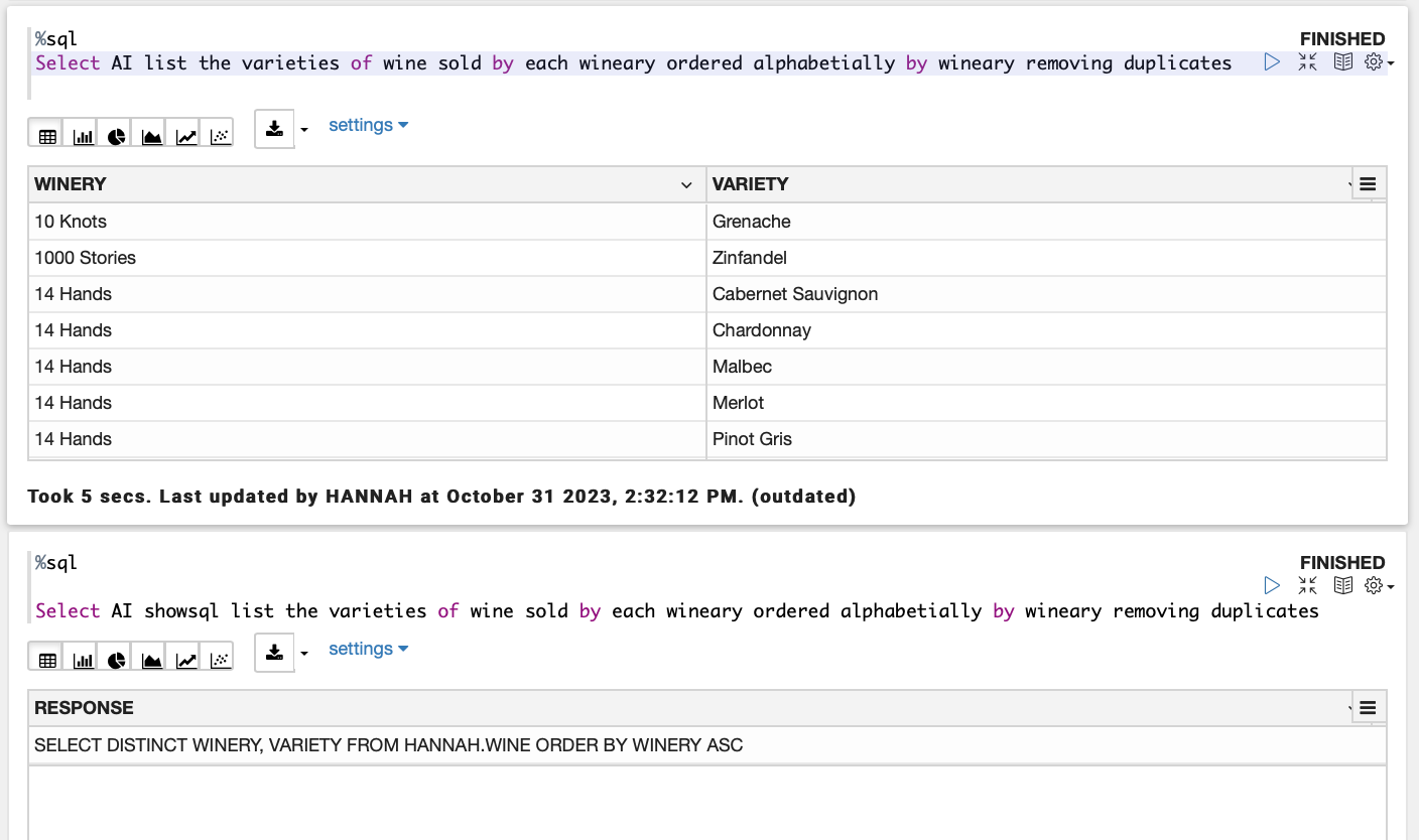 The combination of both LLM models and ADB specific metadata means SQL specific to your database can be generated, and then executed on your data, with inherited security and authentication features of the database.