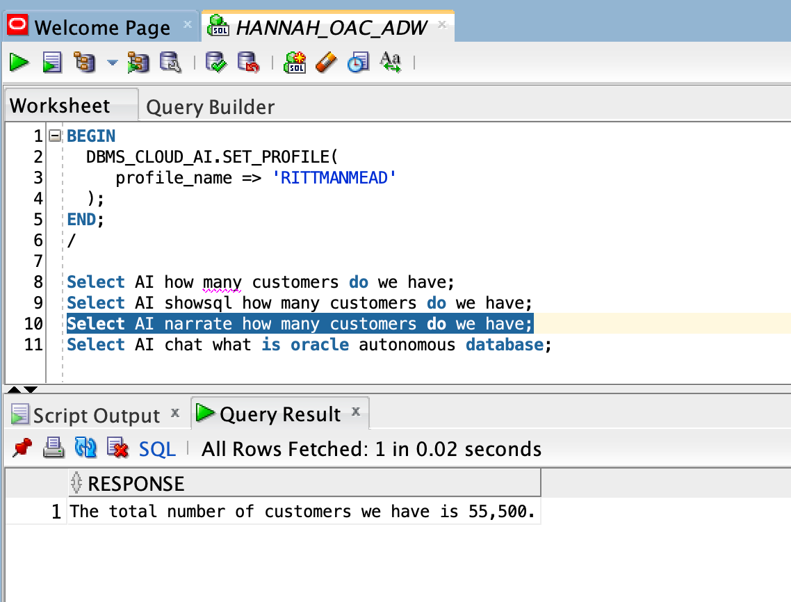 END;You then need to create your DBMS_CLOUD_AI profile, I've named mine RITTMANMEAD, but it could be anything you like. Here, you can list the specific schemas and table names whose metadata will be supplied to the AI provider you are connecting to. This will limit the tables that the generated query can use, since the provider has no knowledge of additional schemas or tables, and therefore this will need to be recreated if you wish to use Select AI with further schemas or tables.