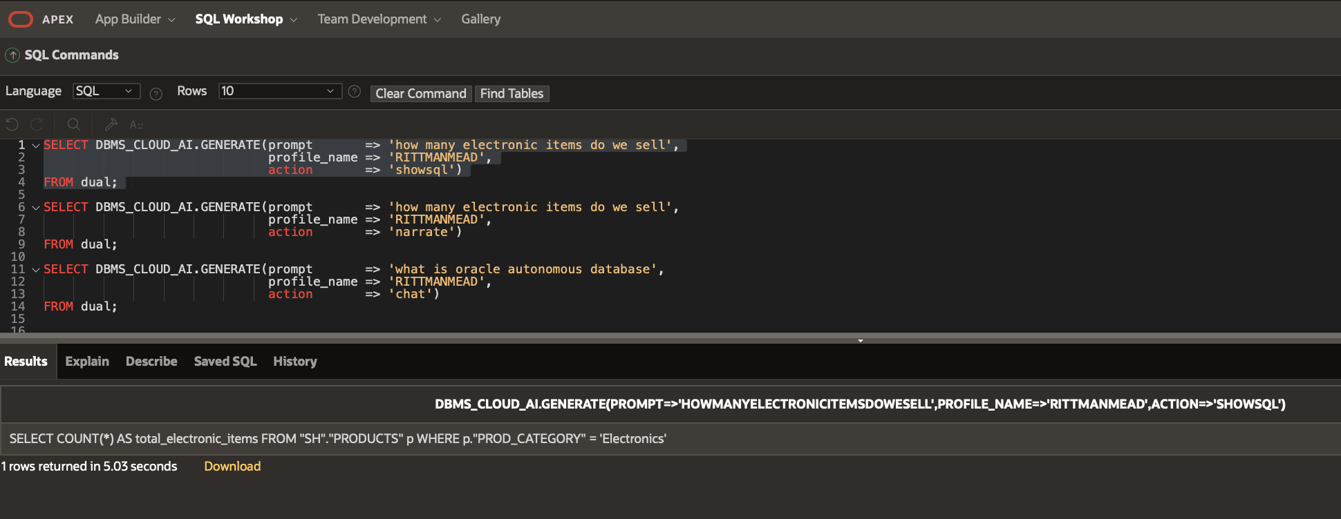 From APEX you can only use the features via the DBMS_CLOUD_AI.GENERATE function as shown in the examples below. From within APEX these can easily be made into a web application, allowing anyone to query the tables you specified in the profile.