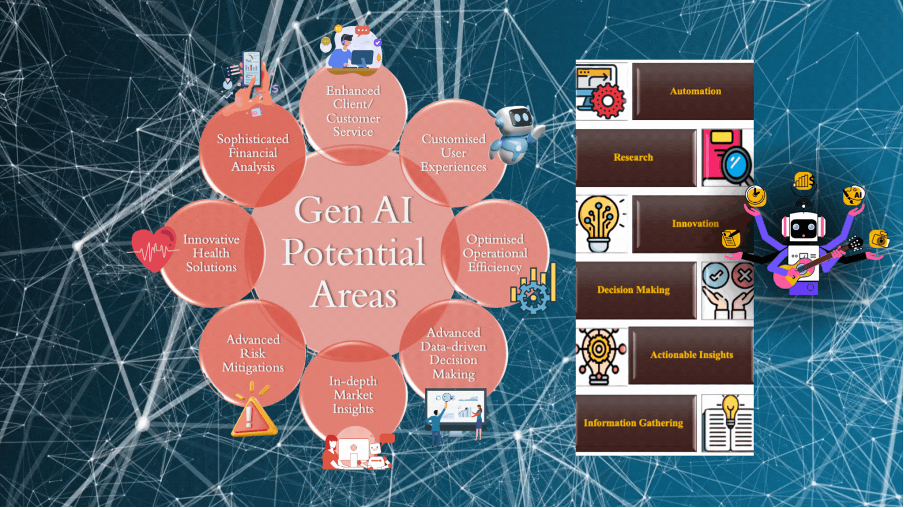 As we can see, the major areas where Gen AI has the highest potential to bring exponential growth are in the areas of Automation, Research, Innovation, Decision making, Actionable Insights and Information Gathering.