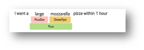 In the above example, the user input says, ‘I want a large mozzarella pizza within 1 hour’. This request can be mapped to 3 entities – PizzaSize, CheeseType and Pizza; helping in identifying the specific information with respect to the size of the pizza, type of cheese and food type ordered.